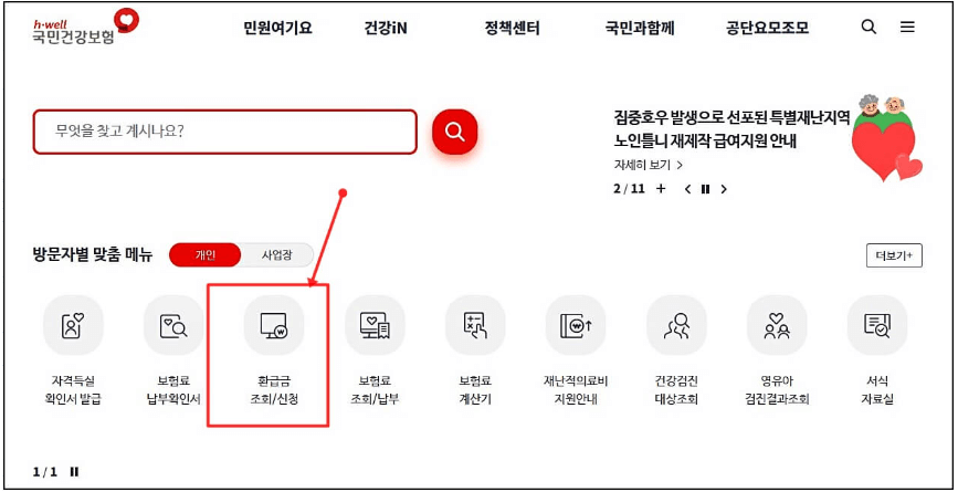 ➡️ 홈페이지 상단 방문자별 맞춤메뉴 - '환급금 조회/신청' 을 선택하시면 됩니다.