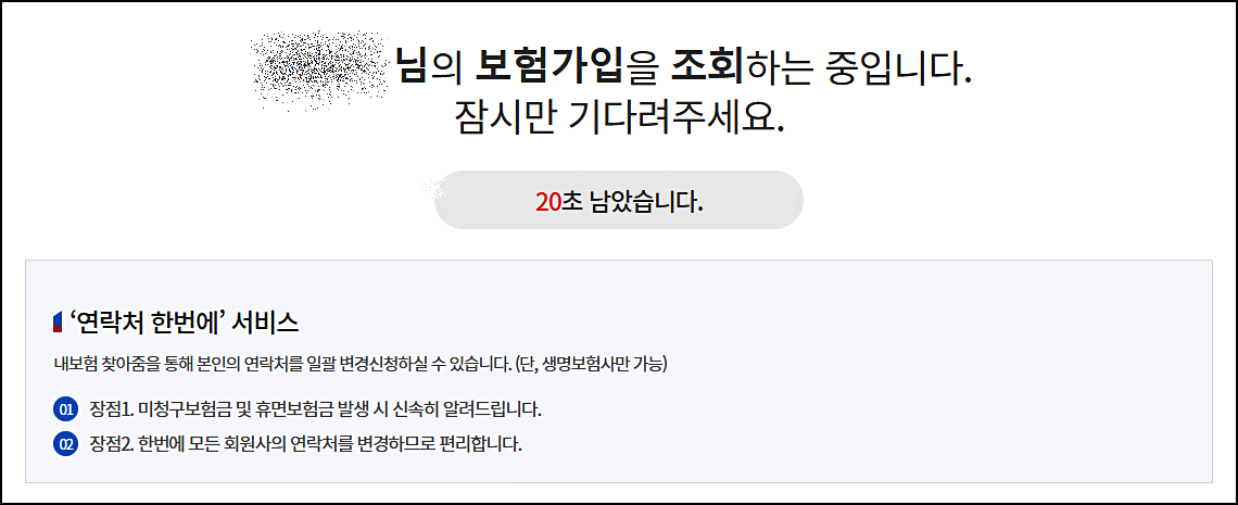 약 30초 정도 소요되며 연락처 한번에 서비스를 신청하시면 미청구보험금 및 휴면보험금 발생시에 바로 문자로 알려 주며, 한번에 모든 회원사의 연락처를 변경하기 때문에 매우 편리한 서비스입니다.