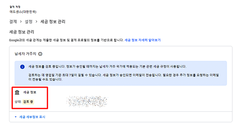 ✅ 제출을 하고 난 뒤 세금정보 검토중이 나오며 추후 승인됨으로 나오게 됩니다.