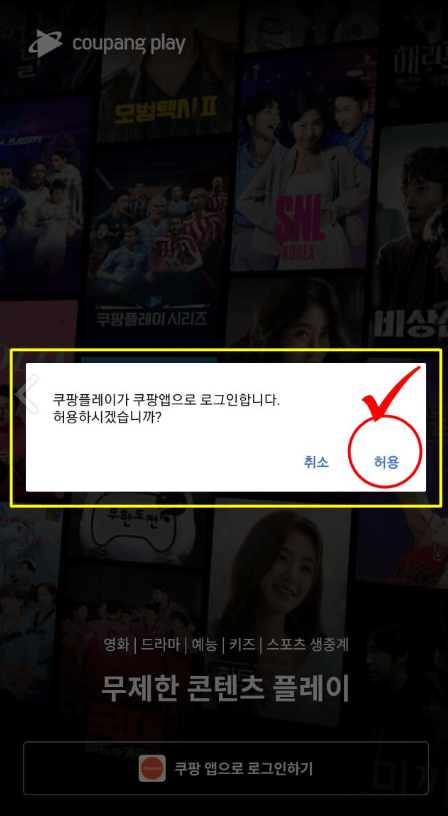 ✅ 쿠팡회원 일 경우 쿠팡플레이 쿠팡앱으로 로그인을 허용 선택 하면 됩니다.