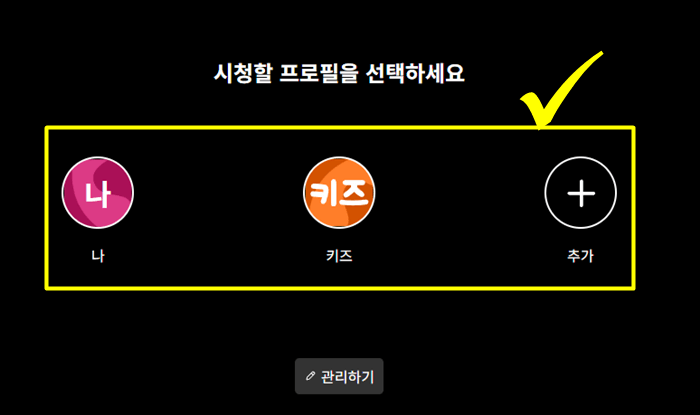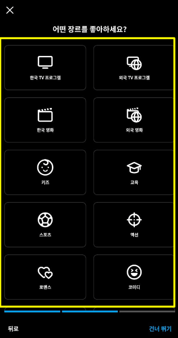 ✅ 프로필을 선택할 수 있으며 , 성인 or 키즈 등 선택해서 설정할 수 있습니다. 원하는 장르 또한 선택 혹은 건너뛰기를