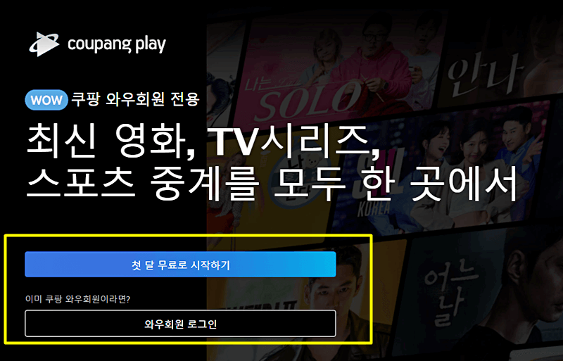 쿠팡플레이는 쿠팡와우회원에 가입되어 있는 회원일 경우 별도로 추가 로그인 없이 시청하실 수 있습니다.